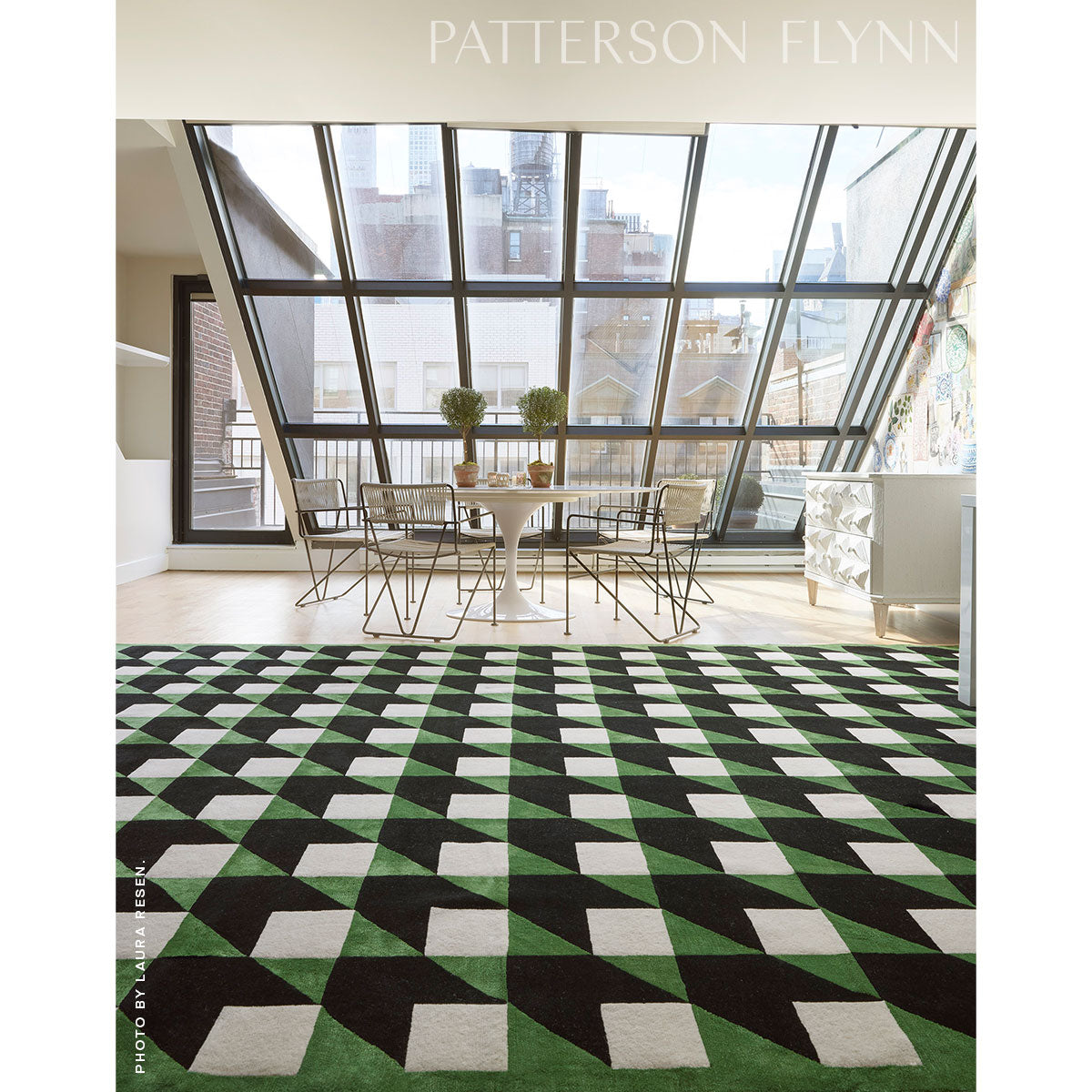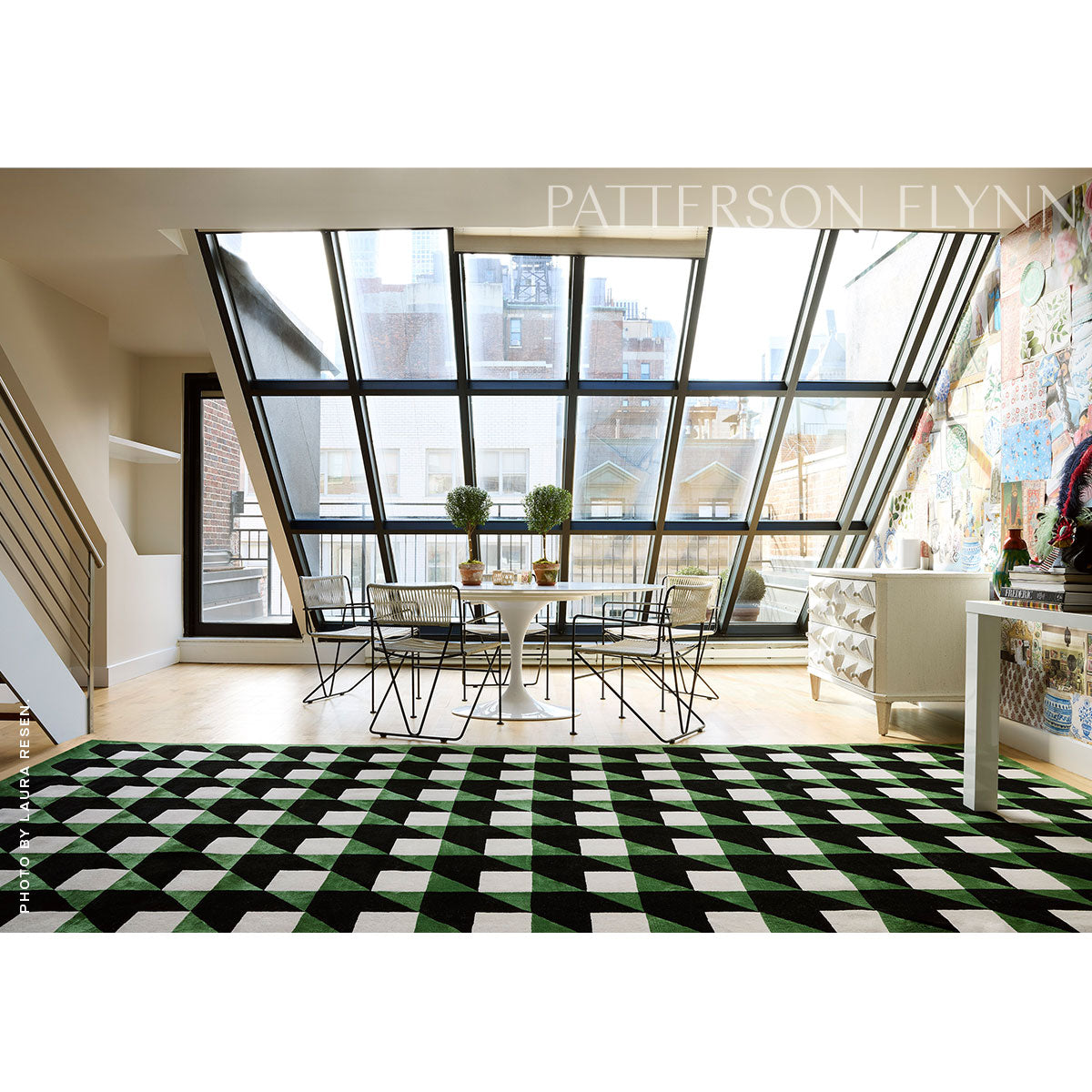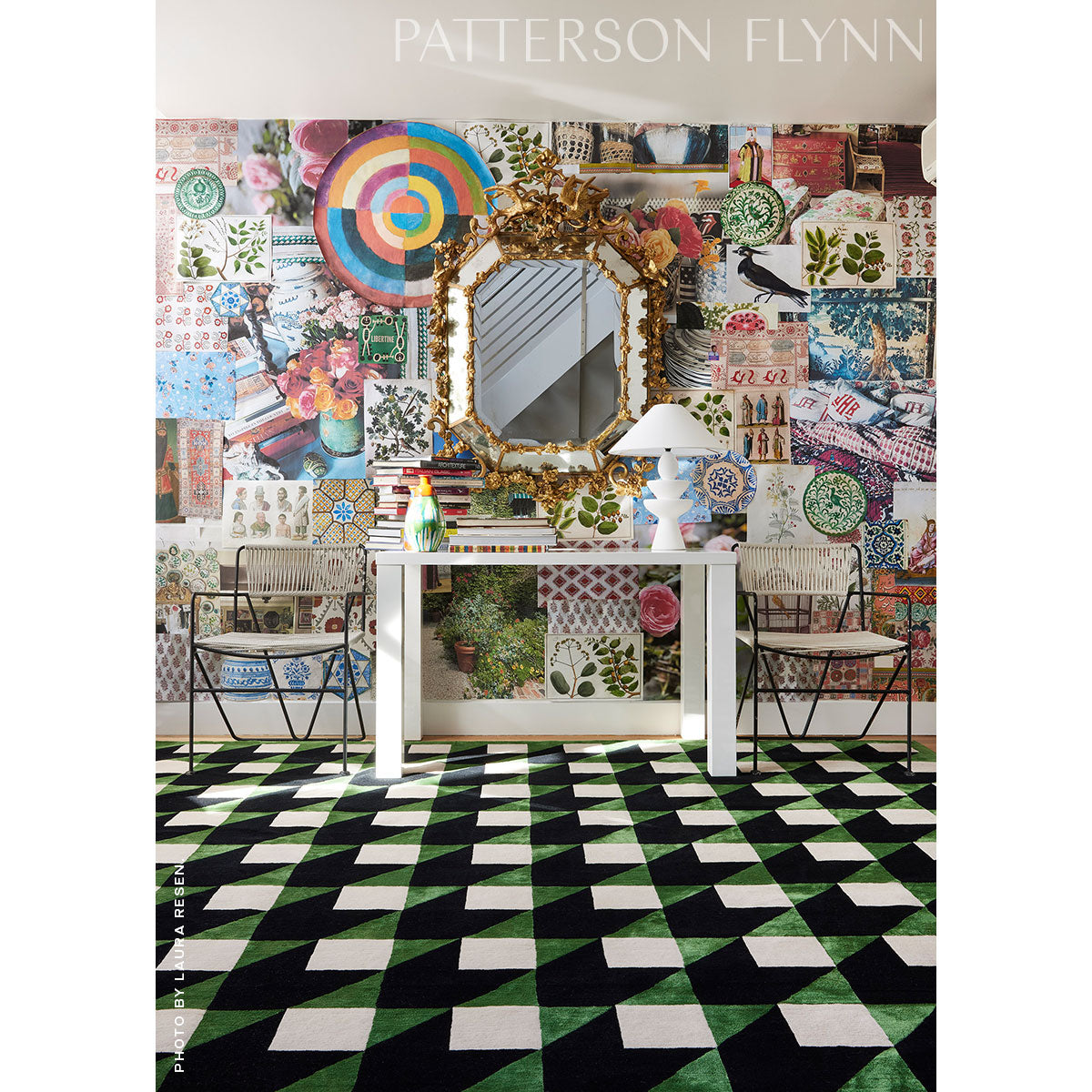 Graphic and bold, Jupien has a ‘70s modern appeal that’s just as at home with Georgian antiques as it is with Mondrian and Lucite. A grid of ivory squares march across an emerald-green background, with elongated black chevrons creating a three-dimensional illusion. A combination of fibers adds to the effect: the motifs are in wool while the background is silk, offering a textural contrast and an unparalleled hand. Part of Johnson Hartig’s first collection with Patterson Flynn, Jupien features a Tibetan hand-knotted construction.