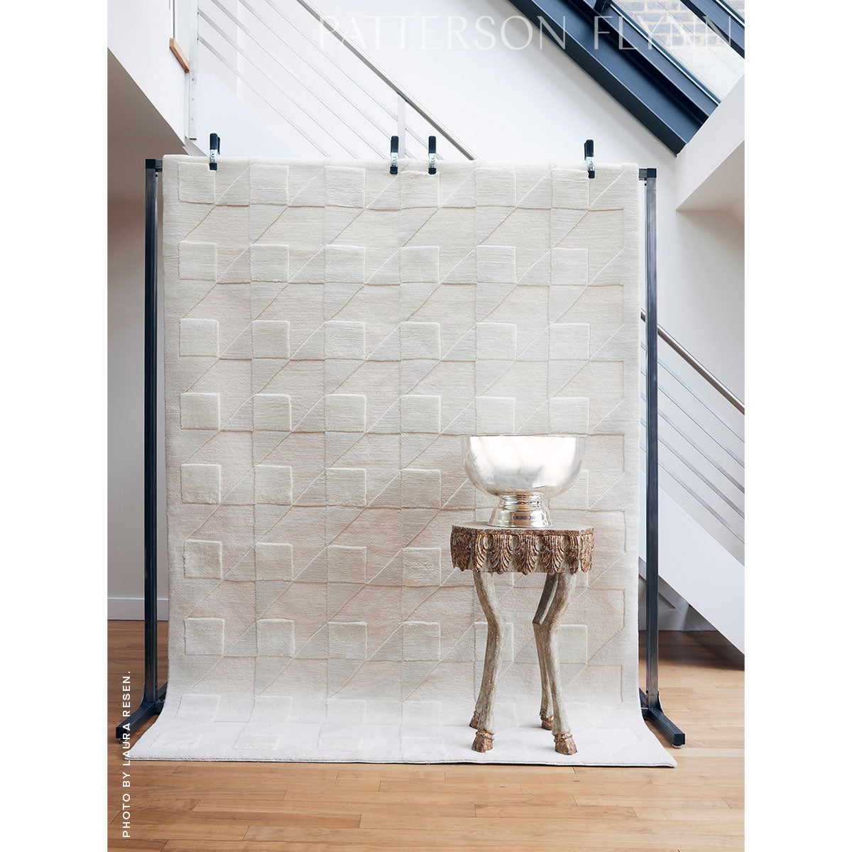 Graphic and bold, Jupien has a ‘70s modern appeal that’s just as at home with Georgian antiques as it is with Mondrian and Lucite. In solid ivory, this rug is a study in textures, with varying pile heights creating the tone-on-tone pattern, The highest pile, which defines the central squares, is 100 percent silk, the lowest is 100 percent wool, and the medium pile is a 50-50 blend. The result? Quiet sophistication and a sumptuous hand. Part of Johnson Hartig’s first collection with Patterson Flynn, Jupien features a Tibetan hand-knotted construction.