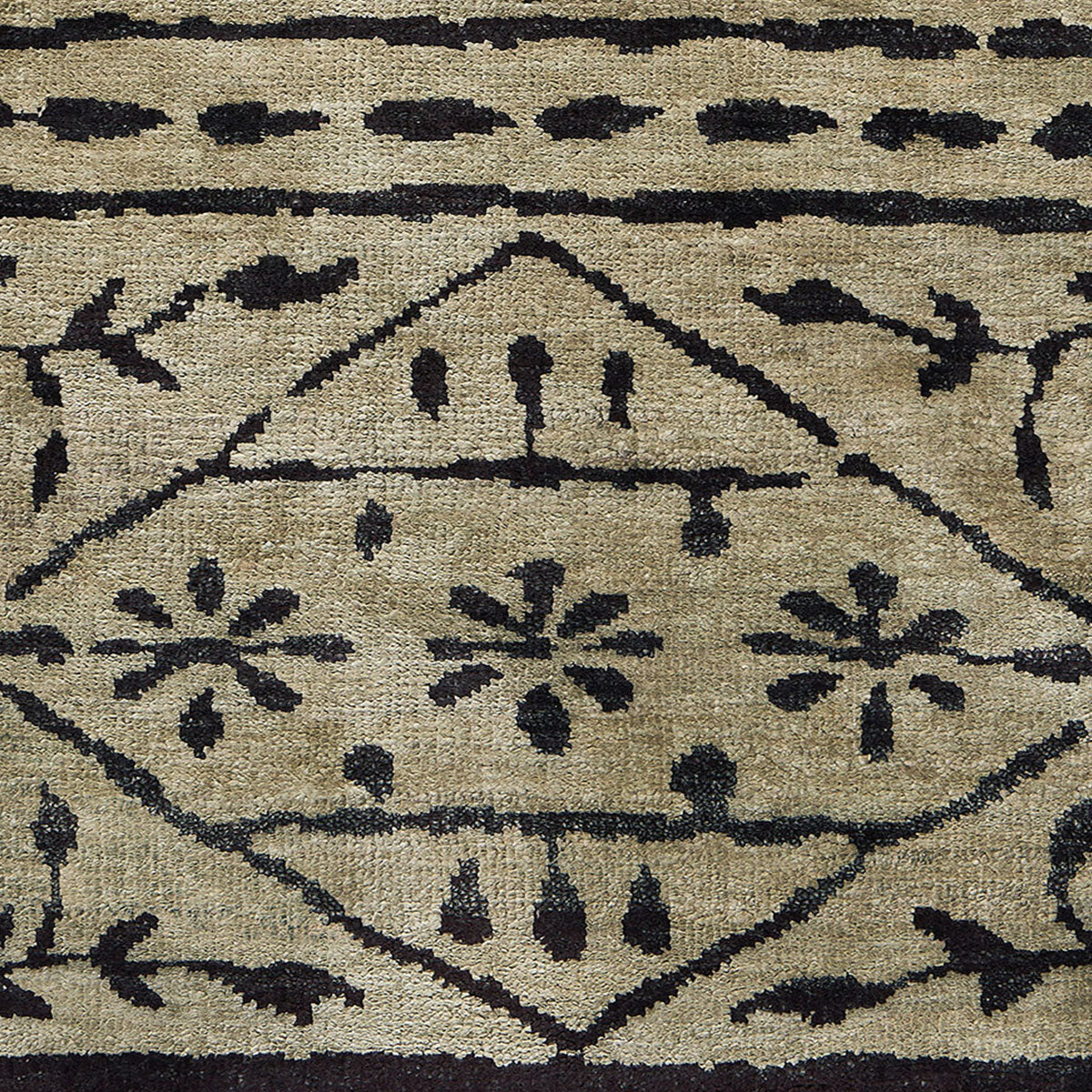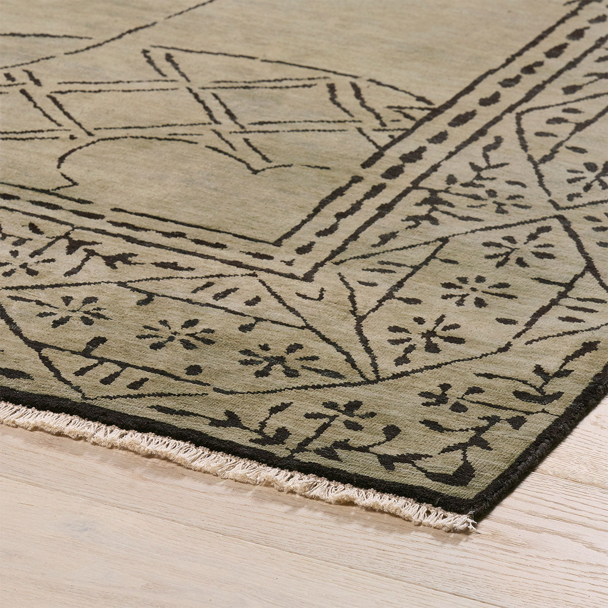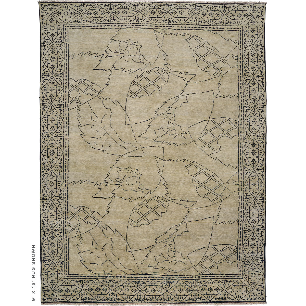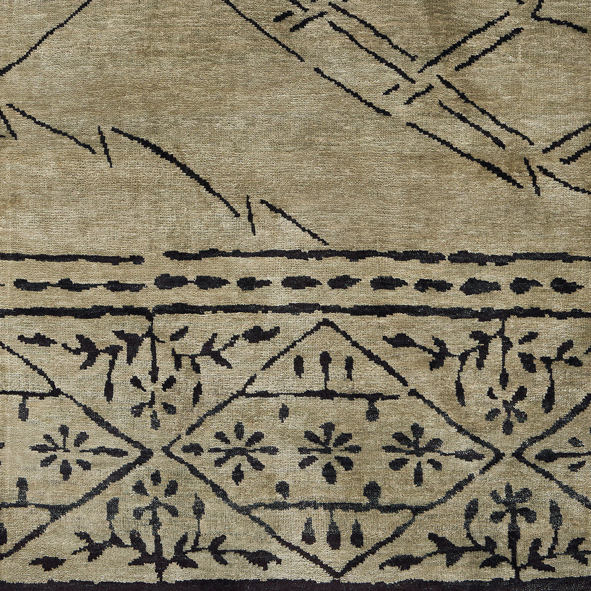 Designed in collaboration with Thomas O’Brien, Kyoto was conceived as a companion to our Haiku rug. Haiku’s main motif, inspired by a vintage Indian hand-block print, forms the border while the central field of large-scale overlapping leaves is drawn from an Art Deco-era piece from O’Brien’s collection of antique kimono screens. The updated colors inject the formal silk Persian with a certain freshness.