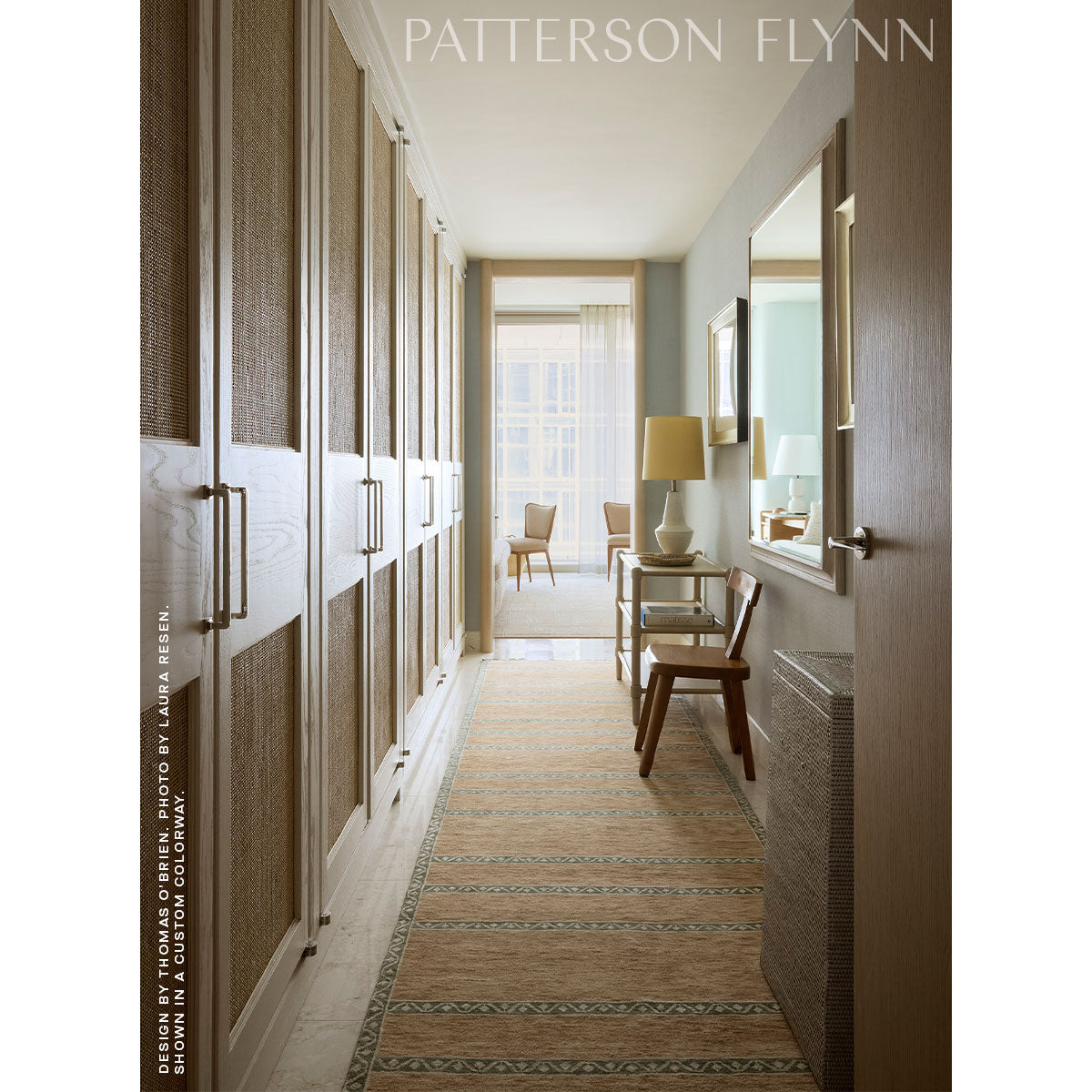 Drawing inspiration from two sources, a modern Scandinavian rug with a rich solid color field as well as a meandering diamond motif from a vintage Turkish piece, Lara features a border and repeating bands that run across this Persian wool hand-knotted rug. An abrash dying technique imparts a gorgeous strie. Designed in collaboration with Thomas O’Brien, Lara was conceived as a companion to our Yuri rug.