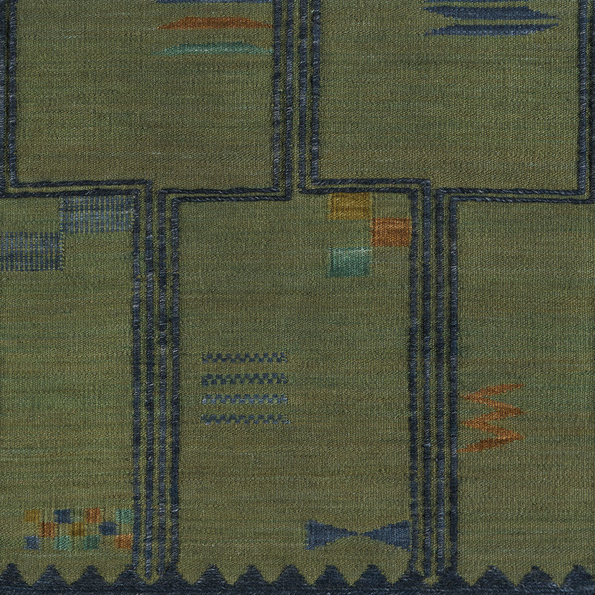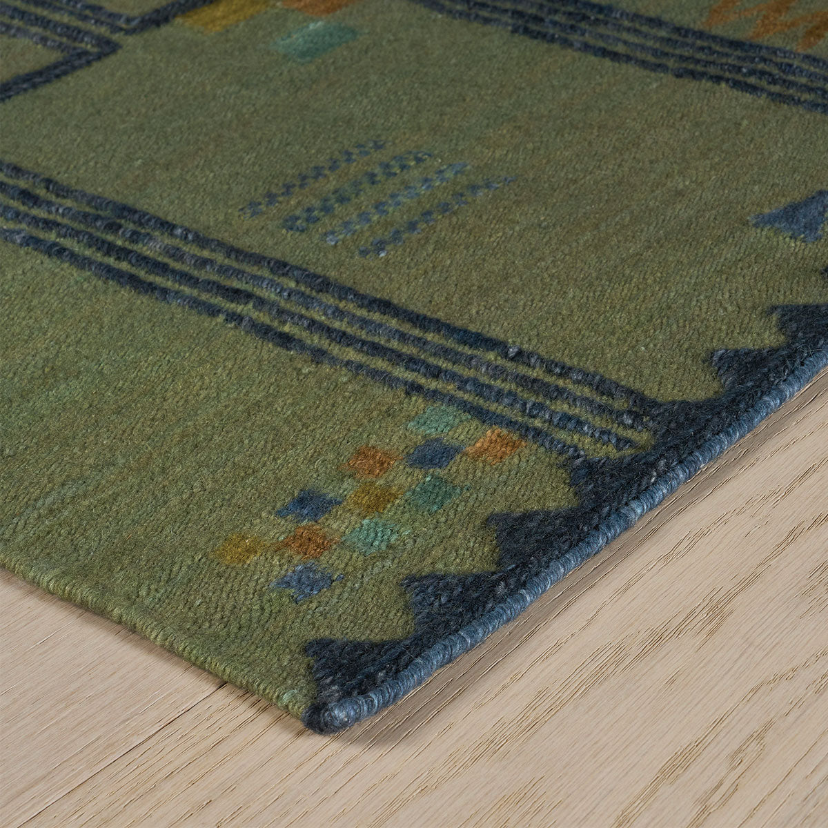 Adavi draws from an antique African textile, weaving hand-dyed fibers, geometric glyphs, and a raised framework into a series of small, textural compositions—finished with edging that gives the flatweave unexpected depth. Its inspiration brings a sense of history and artistry to the design, grounding its modern geometry in a rich cultural lineage.