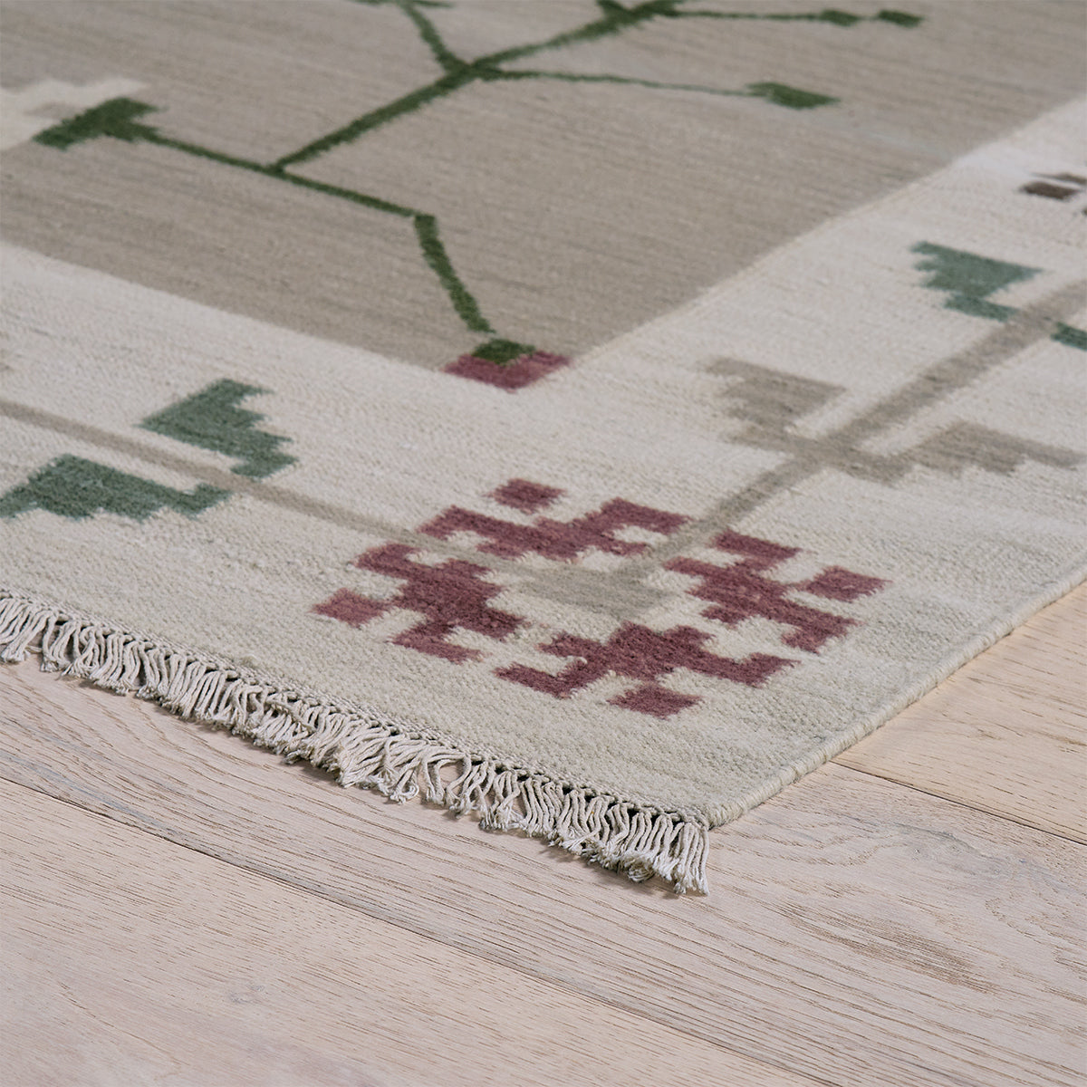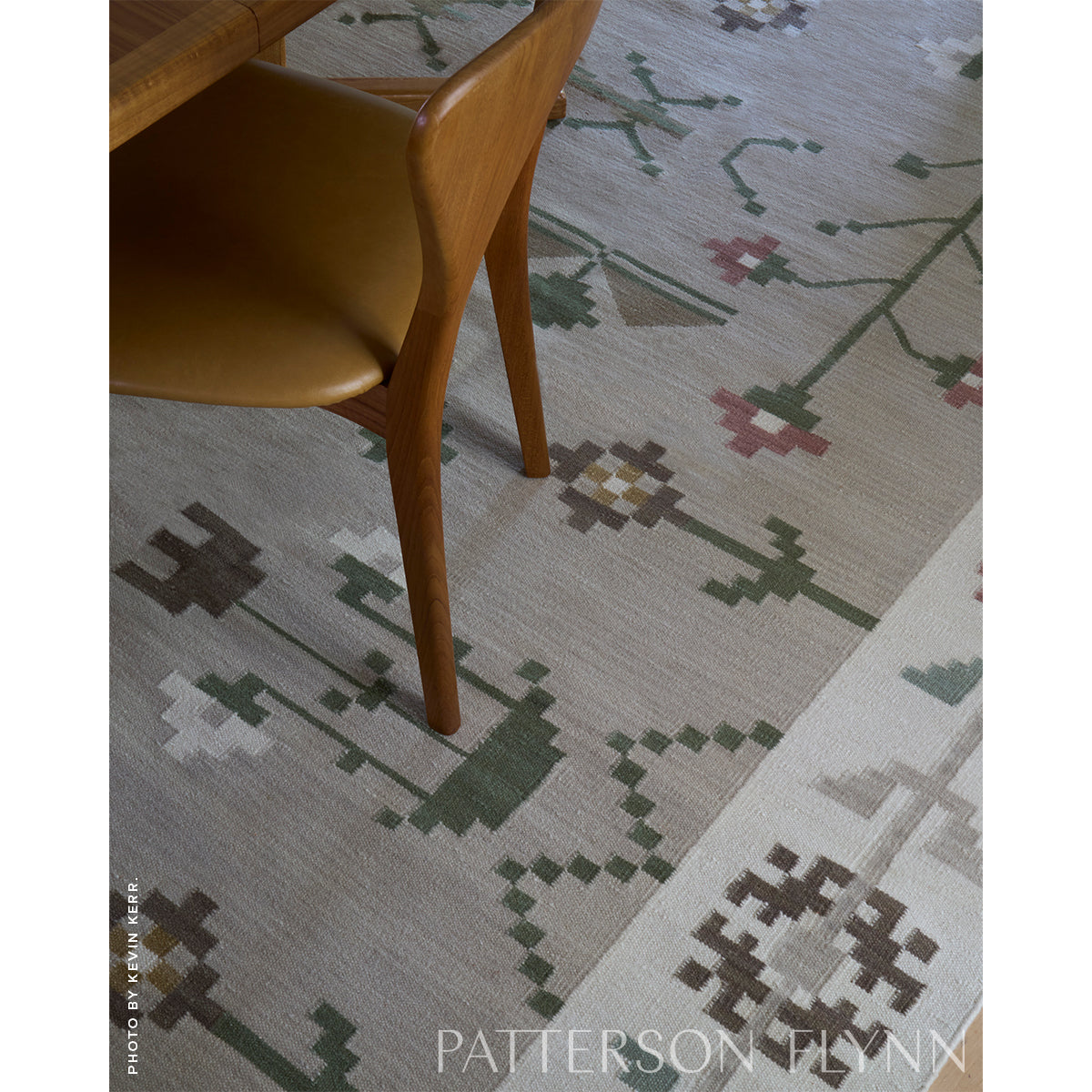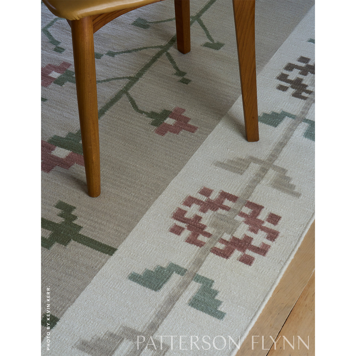 Inspired by an antique Swedish rug, Freyr’s floral design feels as if it’s sprouting from the garlanded border. The wool flatweave has a spare, almost geometric quality that makes it exceptionally easy to use and adaptable to a range of interiors.