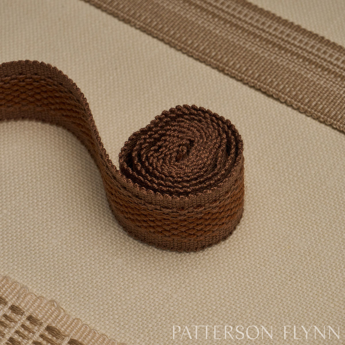Woven in the UK on a traditional shuttle loom, Cardiff Tape Medium is a classic basketweave with fine, plain weave edges. A blend of wool and cotton, it has a subtle strié effect for an extra note of refinement. Use this handsome tonal trim alone or in combination with others to give upholstery, pillows or window treatments a sophisticated finish. Also available in a wider width.