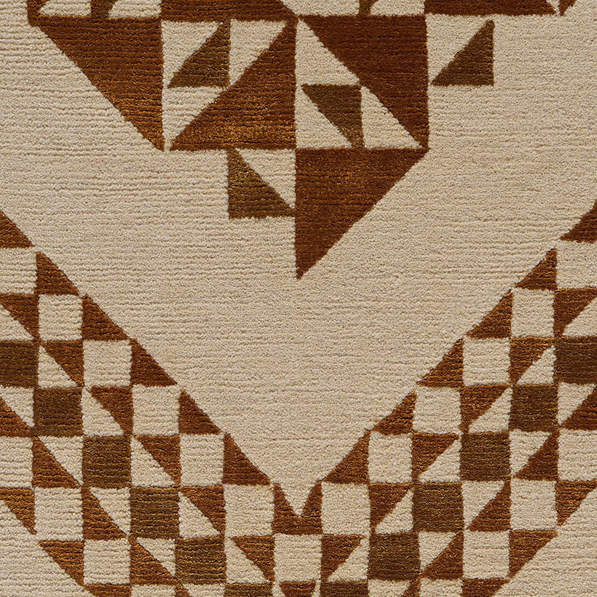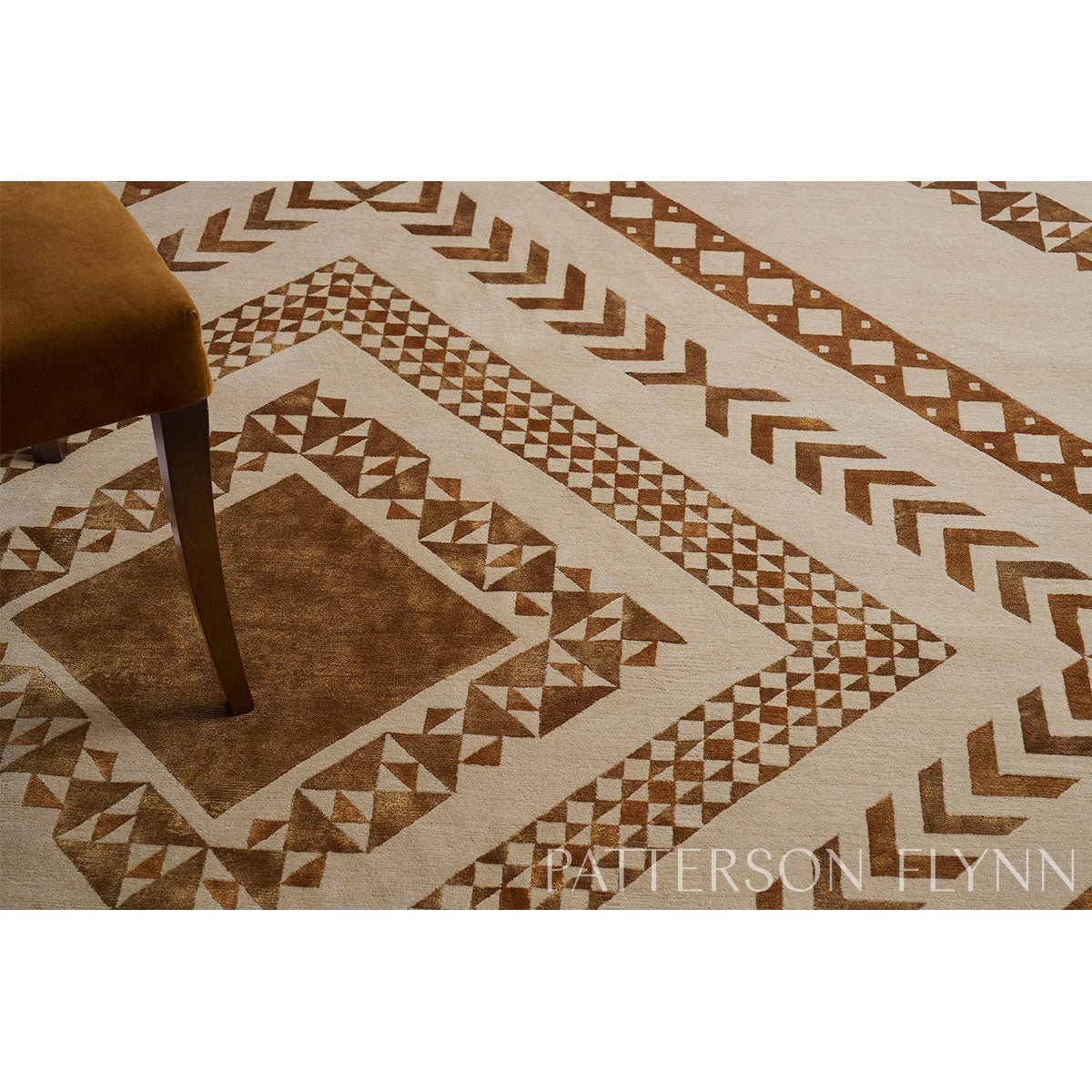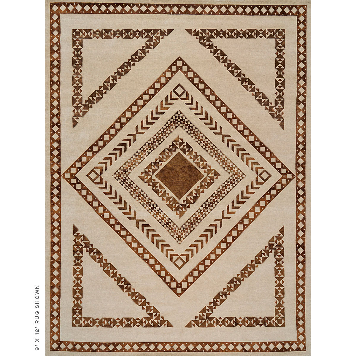 Like light radiating from a central star, Galileo features bands of pattern that pulse outward from a central medallion, playing with scale and geometric energy. The diamonds, squares, and triangles that make up the modern quilt-like design are done in silk, which shimmers against the wool ground of this Tibetan hand-knotted rug.