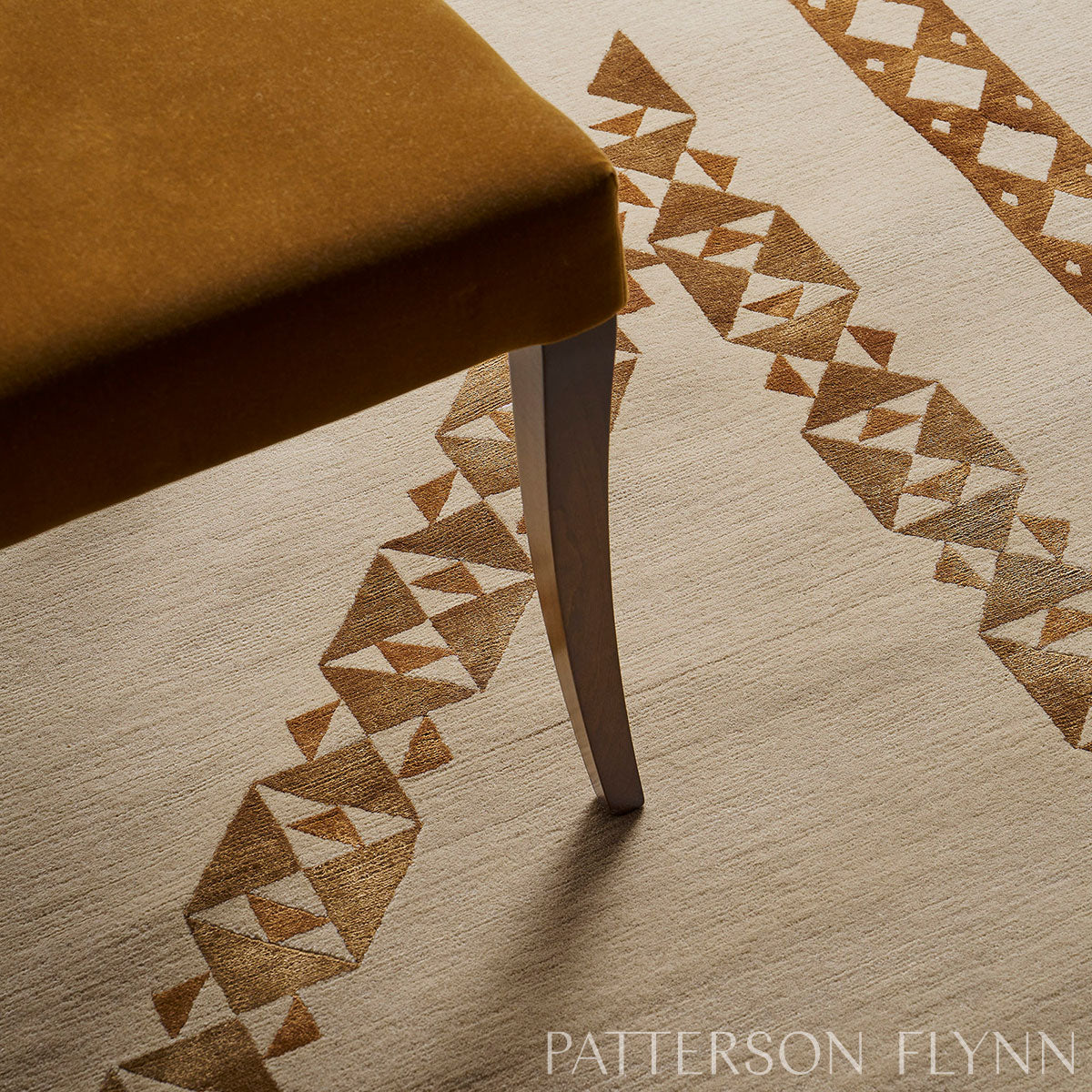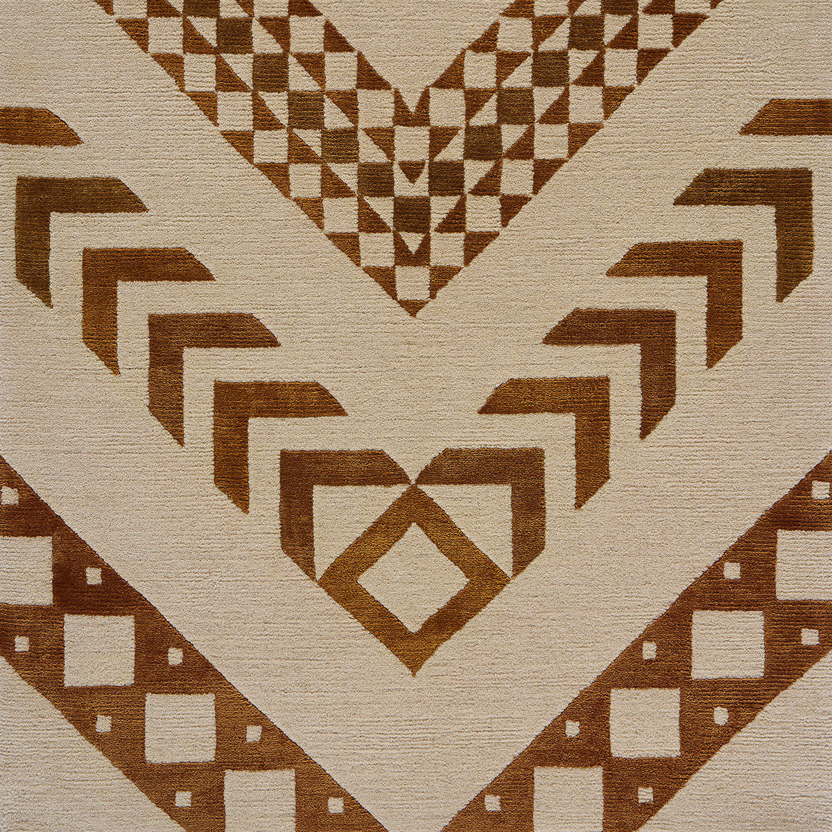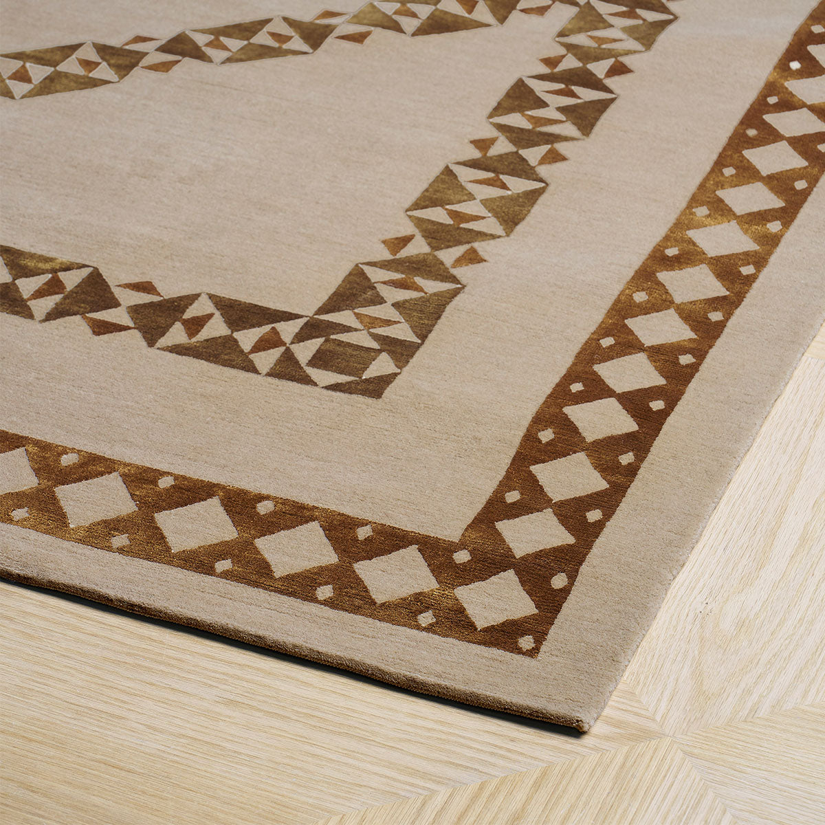 Like light radiating from a central star, Galileo features bands of pattern that pulse outward from a central medallion, playing with scale and geometric energy. The diamonds, squares, and triangles that make up the modern quilt-like design are done in silk, which shimmers against the wool ground of this Tibetan hand-knotted rug.