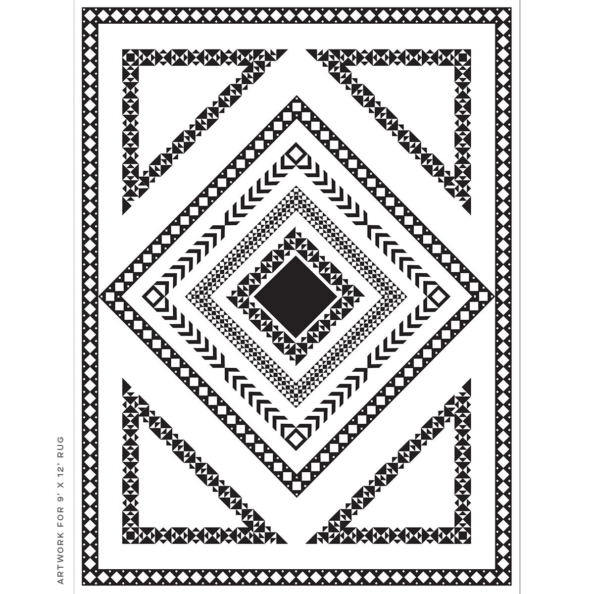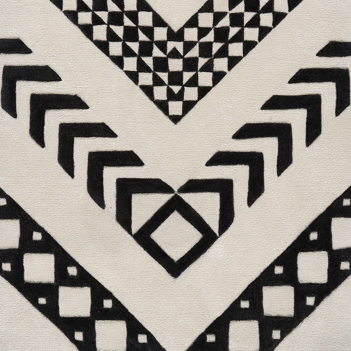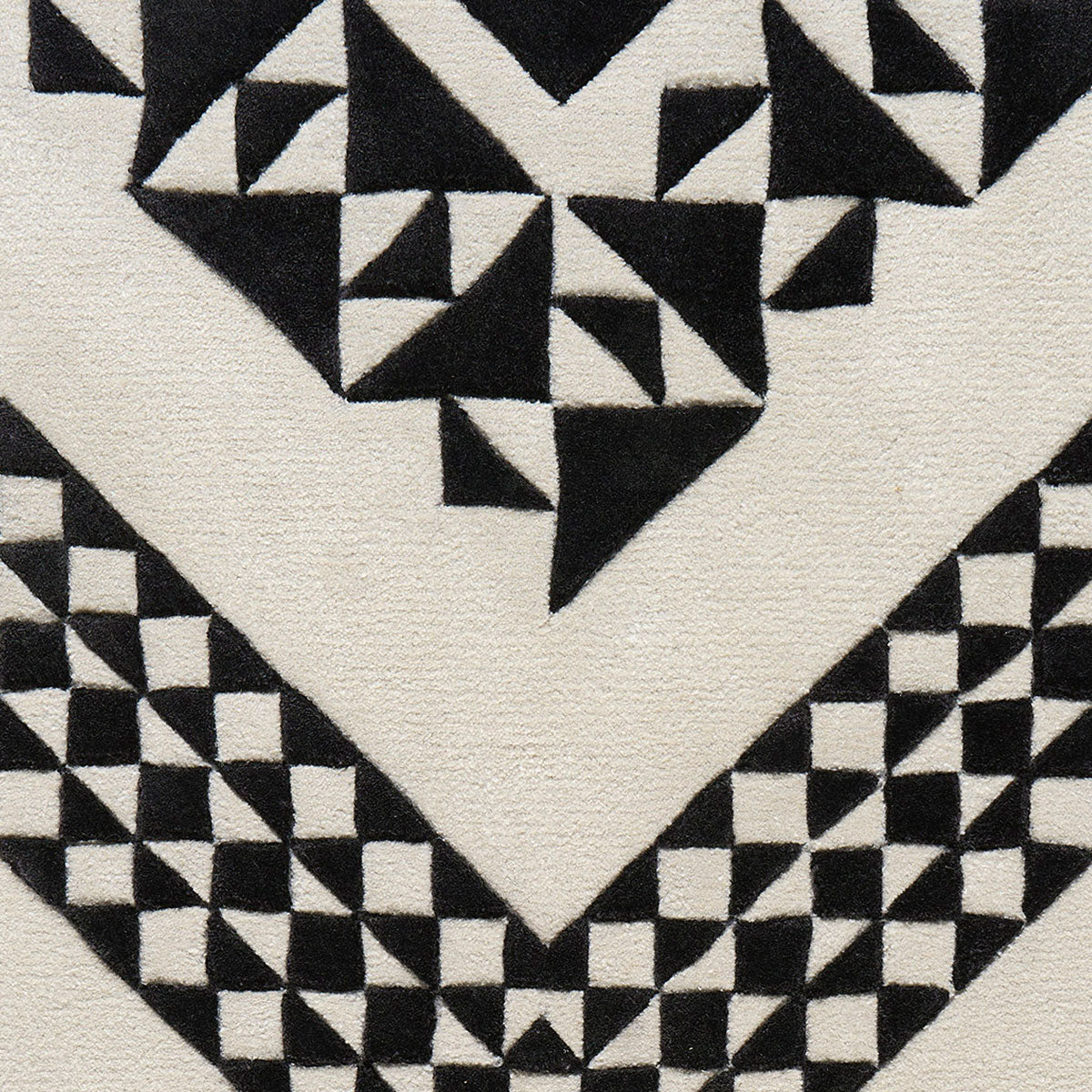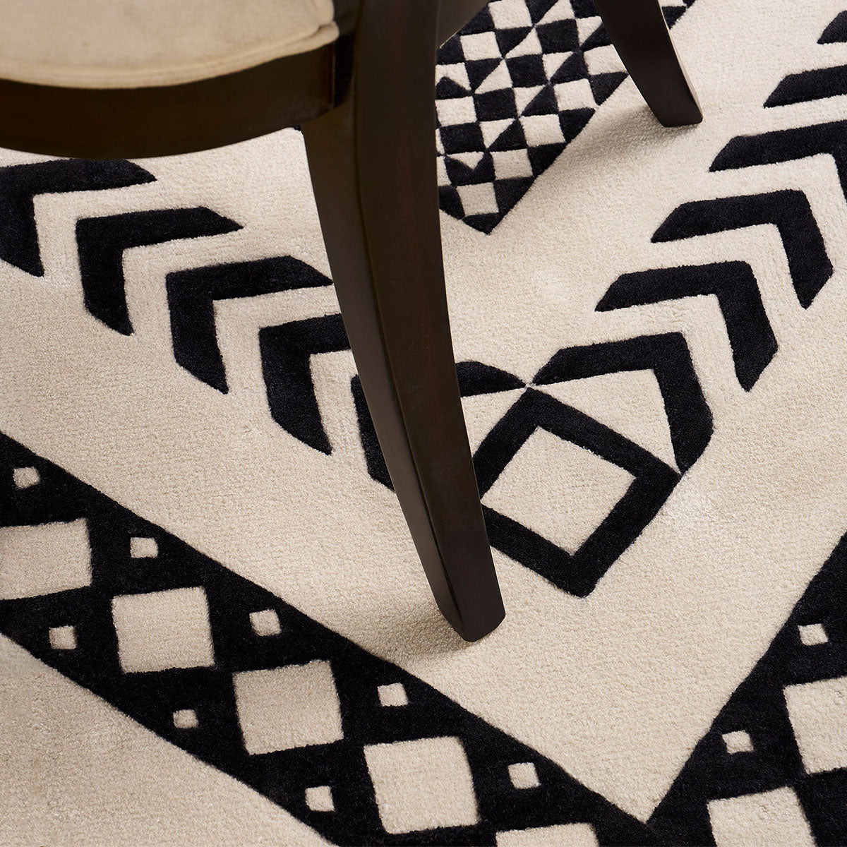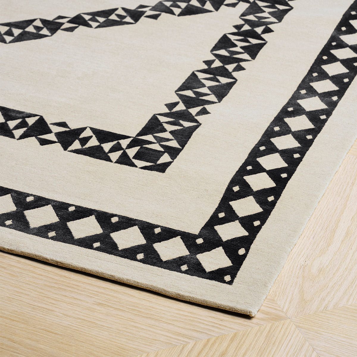 Like light radiating from a central star, Galileo features bands of pattern that pulse outward from a central medallion and play with scale and geometric energy. The diamonds, squares, and triangles that make up the modern quilt-like design are done in black silk, which stands out in graphic contrast against the white wool ground of this hand-tufted rug.
