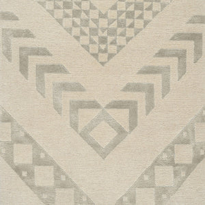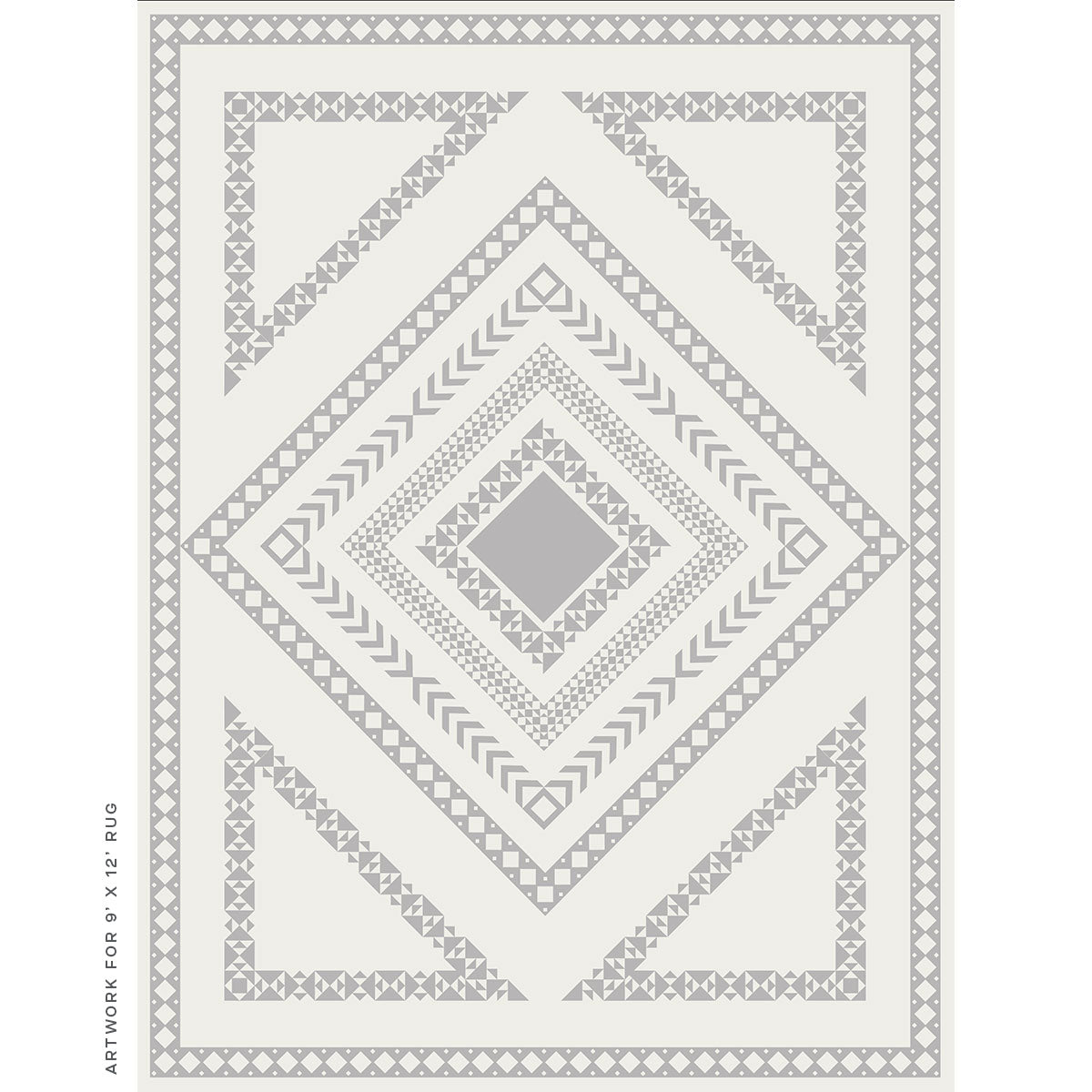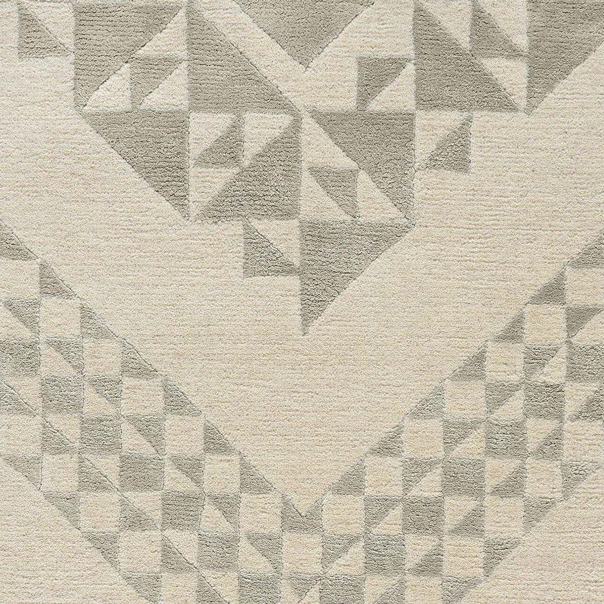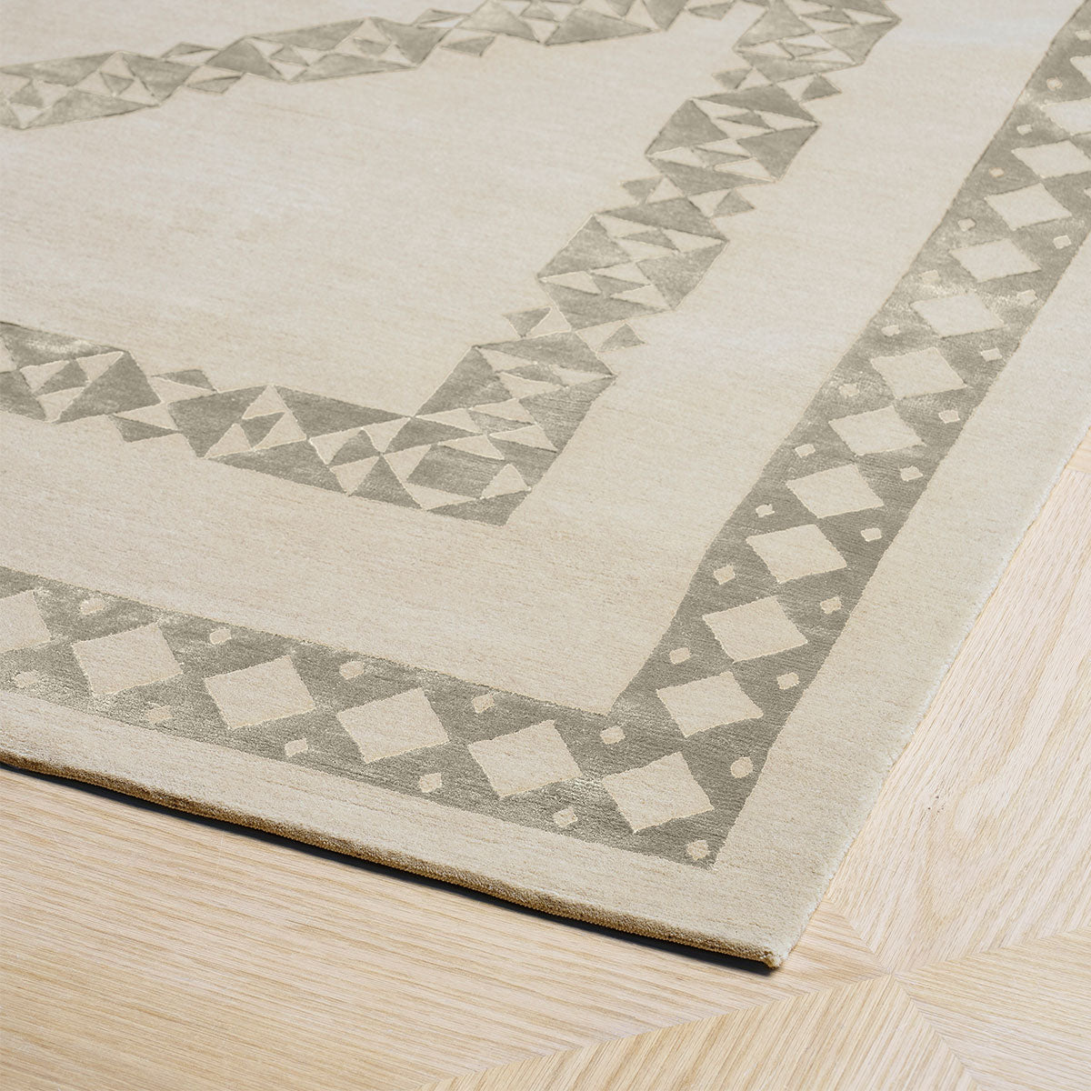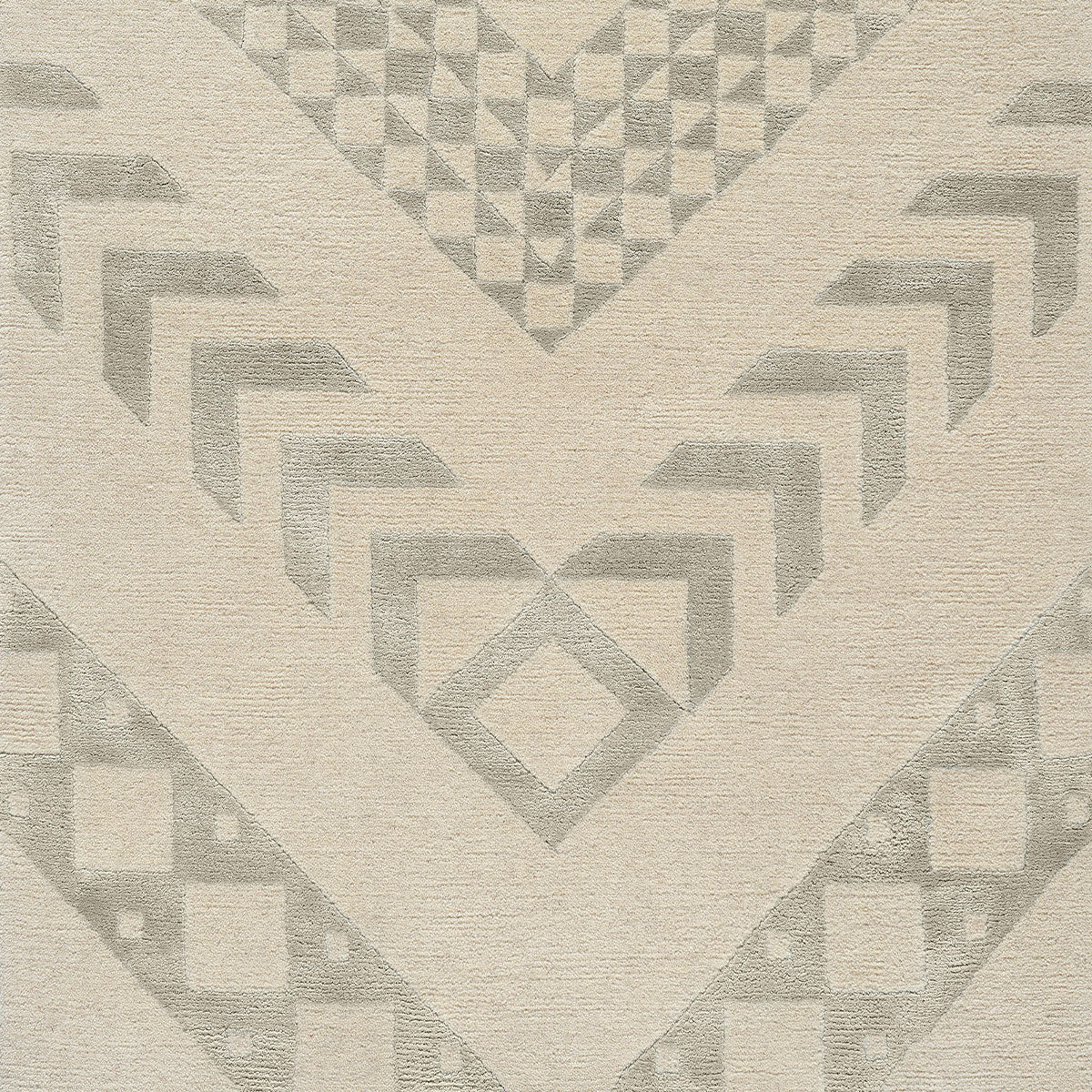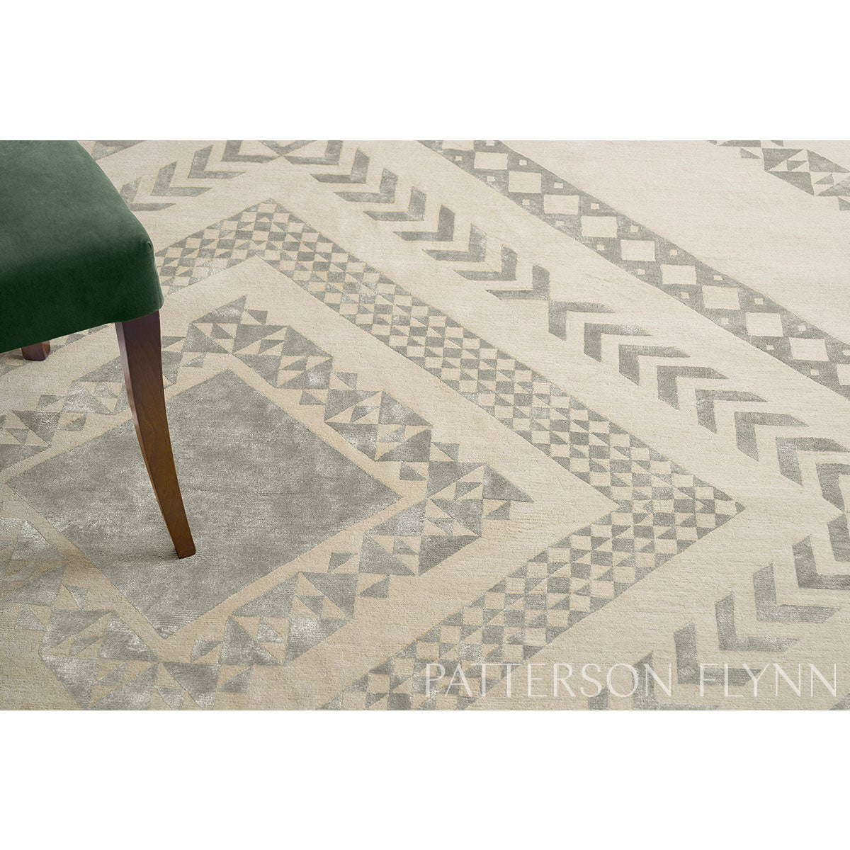 Like light radiating from a central star, Galileo features bands of pattern that pulse outward from a central medallion, playing with scale and geometric energy. The diamonds, squares, and triangles that make up the modern quilt-like design are done in silk, which shimmers against the wool ground of this Tibetan hand-knotted rug.