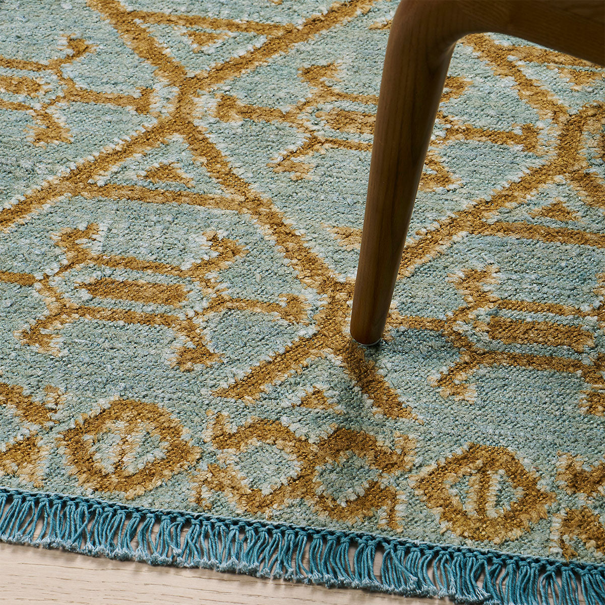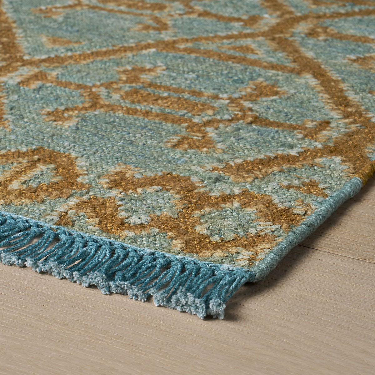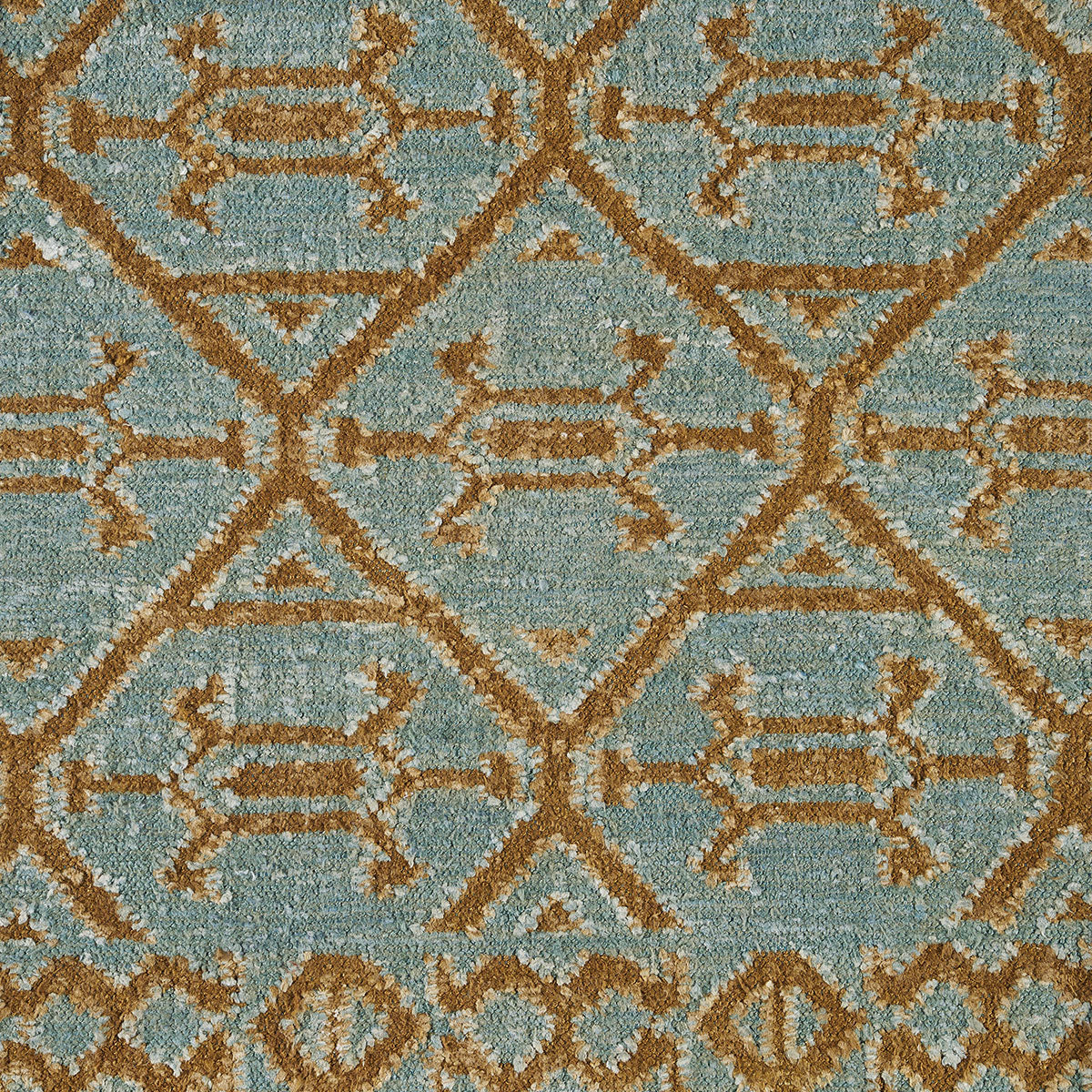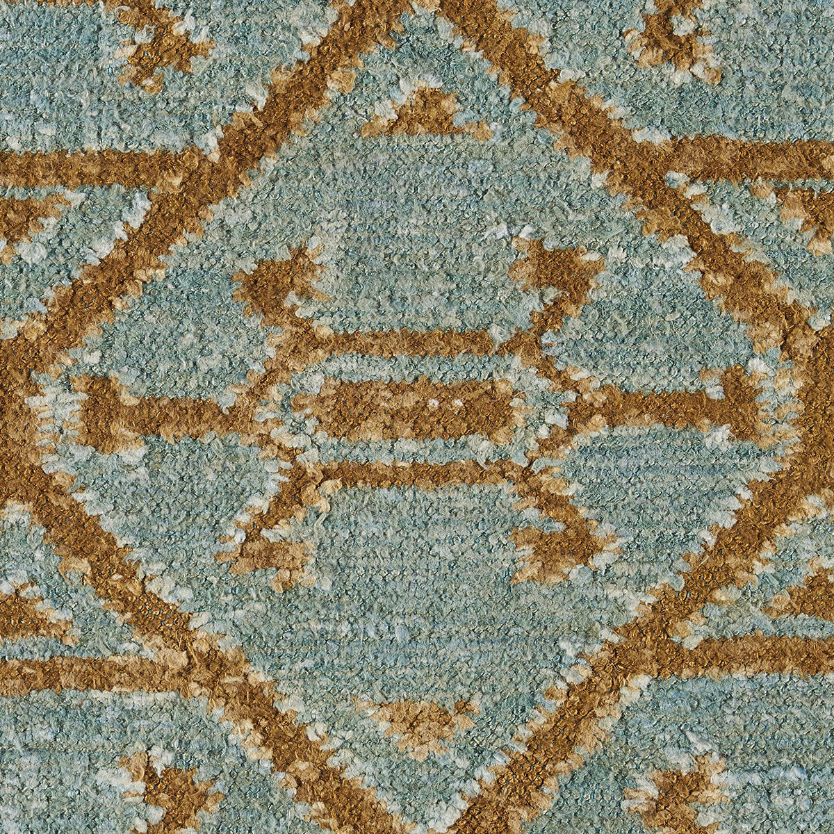 Based on an antique textile motif with the feel of a primitive geometric, Kabir has an all-over pattern arranged with the logic of a trellis, minus any frills or fuss. Done in a usable medium scale featuring a fringe border, the stonewashed silk finish imparts a sophisticated earthiness and tames the shine of the silk.