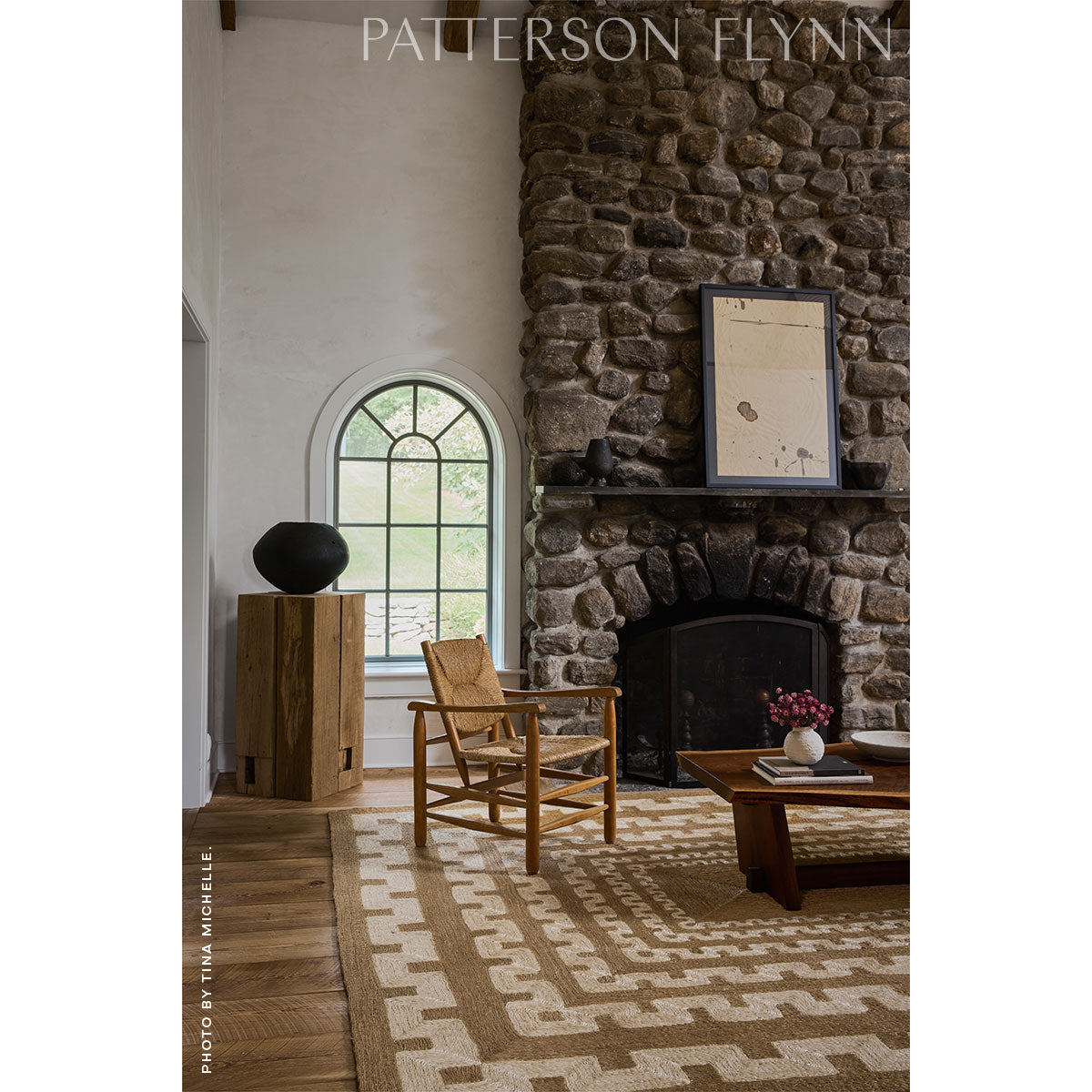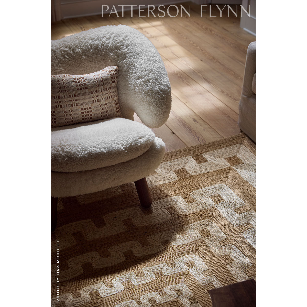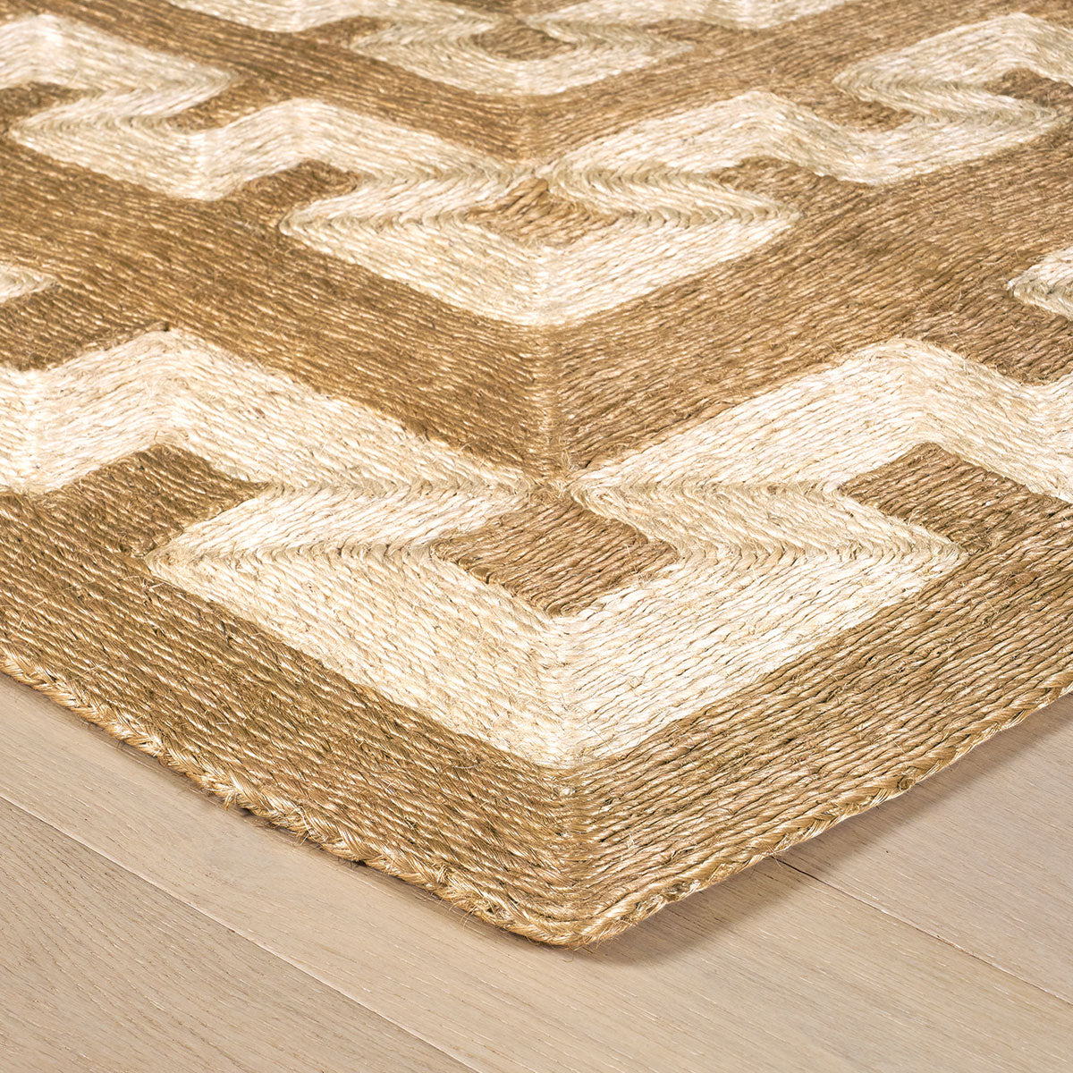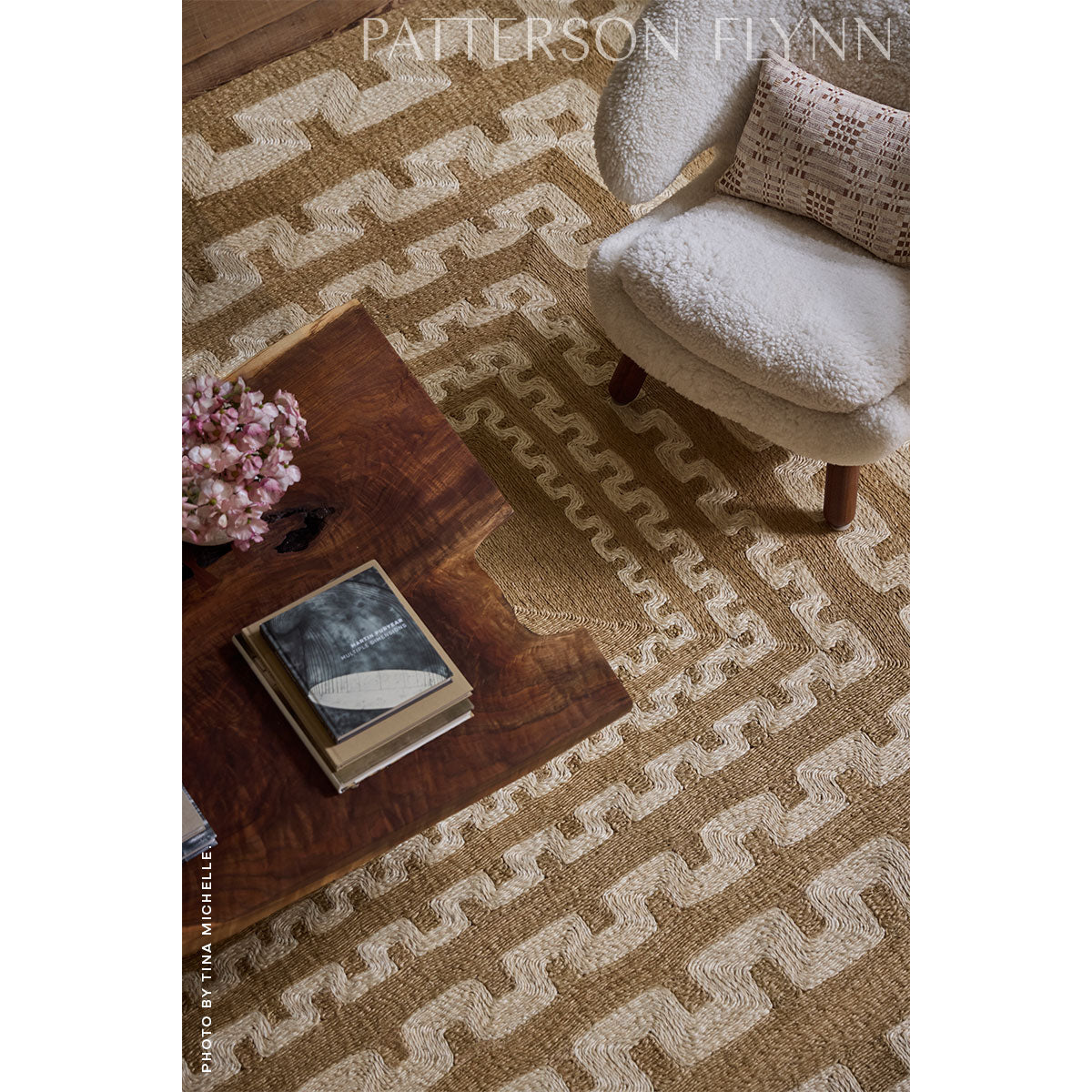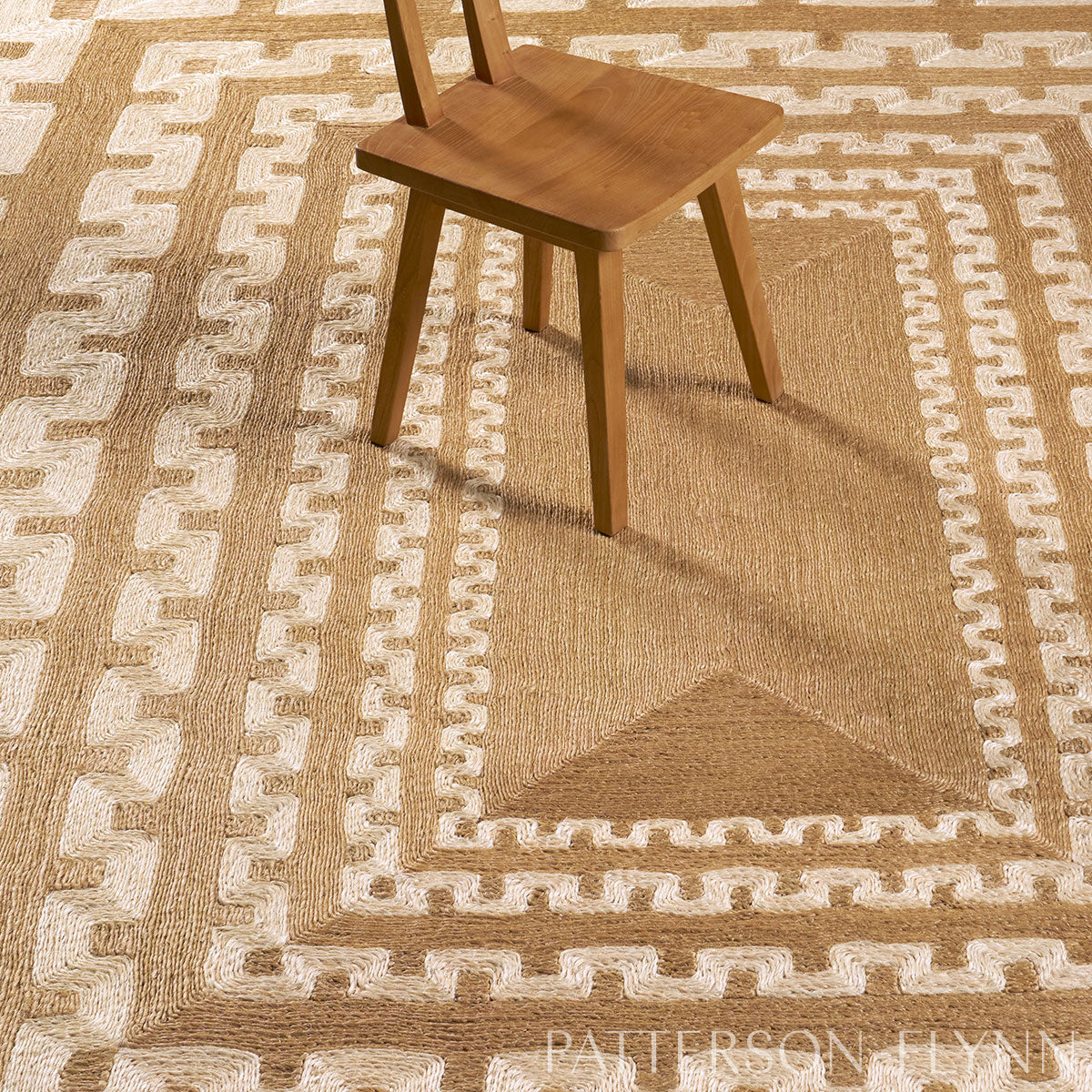 Based on an original silk and wool design by Timothy Whealon, hand-coiled abaca transforms the feel of La Foce, turning a luxe design into something a lot less formal. While the blue colorway emulates the original’s ombré with crenellated rings that go from inky indigo to aqua, the two-color palette of the natural colorway has a sleek and graphic personality.